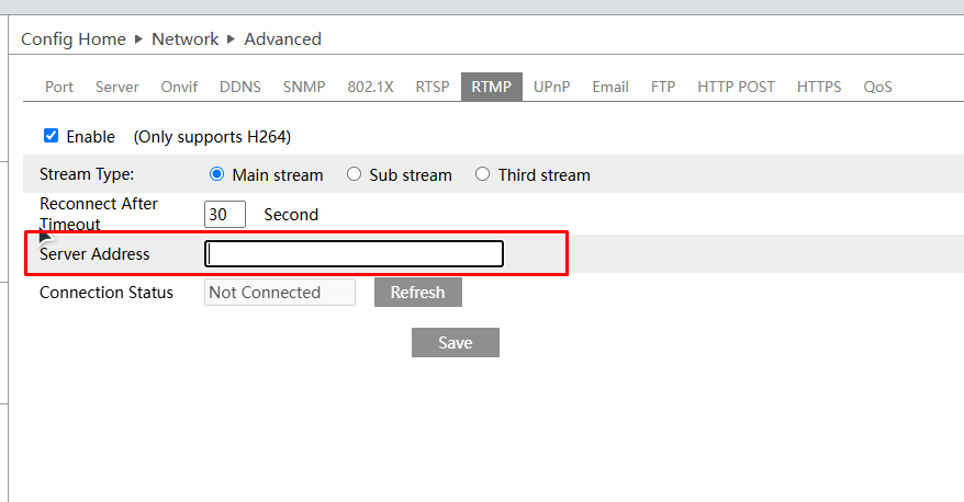 - Return back to the web interface for the Plug & Play IPC and navigate to Config->Network->RTMP. In this menu, please make sure that the option is first enabled. Then choose the specific stream type you want to send to the YouTube Live stream, this also being the stream that you had changed to H.264 encoding in Step #1. You can leave the Reconnect After Timeout option with its default settings, unless you are dealing with an unstable upload bandwidth.